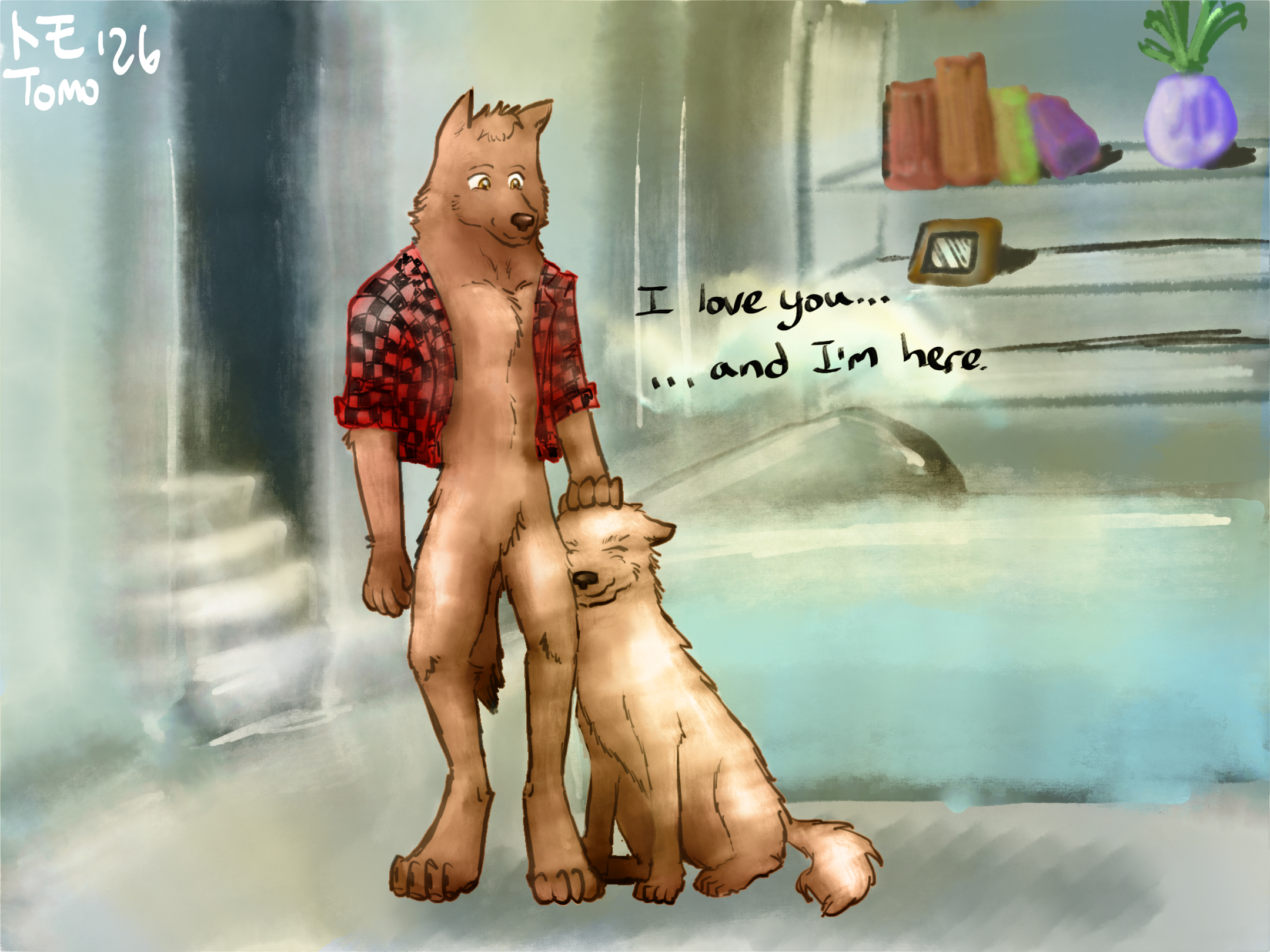 In my dreams, I often attempt to become a wolf, but it seldom ever works, and it has been that way for decades. I deduced that my inner child felt unsafe playing in that way due to childhood trauma, but after some deep healing work, in a recent dream I took on the form of a beautiful brown wolf. This werewolf here is tending to my inner child, bridging the gap between the humans he fears being seen and hurt by and the form he avoided taking on for fear of judgment and exclusion.
